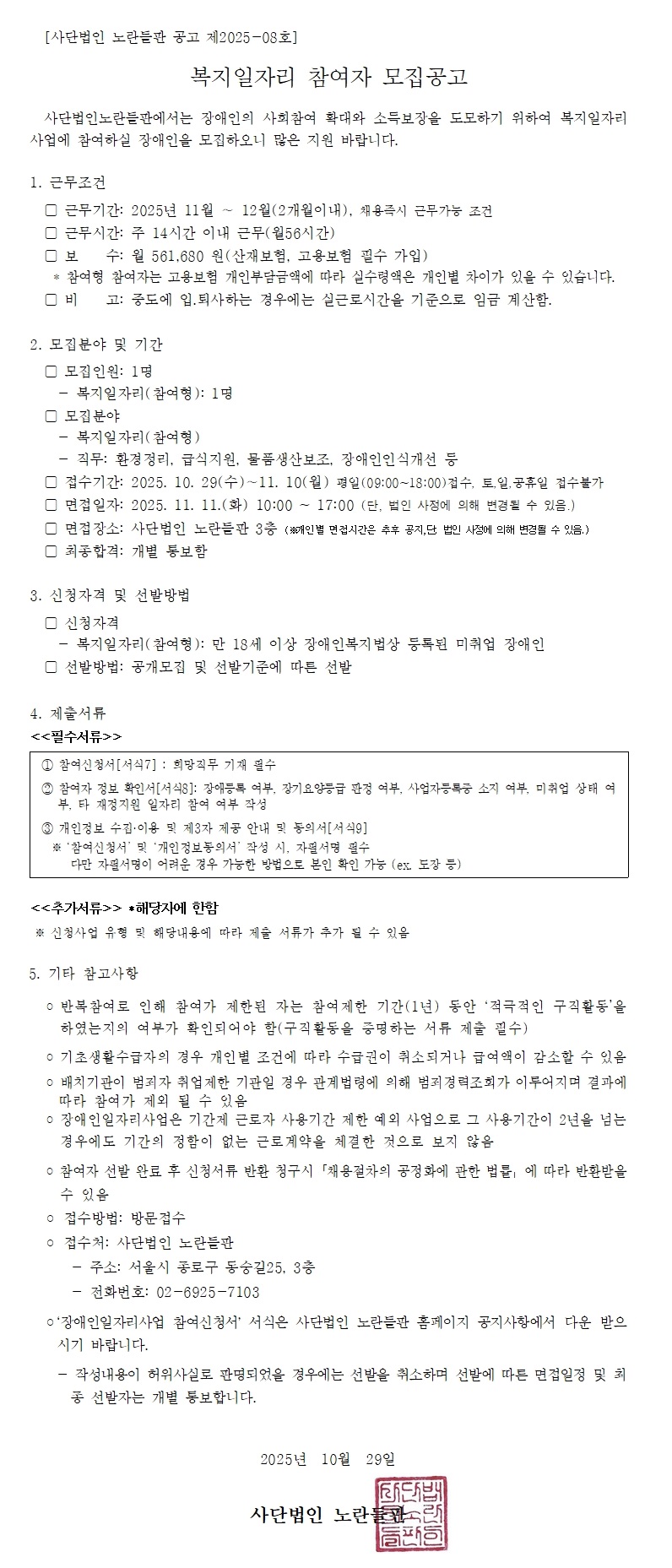 [사단법인 노란들판 공고 제2025-08호] 복지일자리 참여자 모집공고